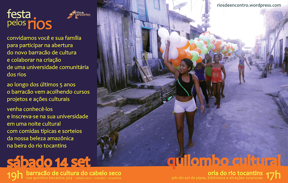 Nesse sábado dia 14 de setembro realizaremos a Festa pelos Rios, na beira do Rio Tocantins, celebrando a inauguração da Universidade Comunitária dos Rios, no novo Barracão de Cultura do Cabelo Seco.