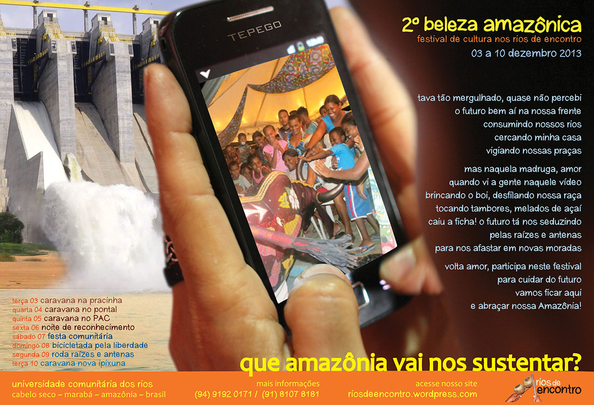 Entre dias 03 e 10 de dezembro realizaremos nosso 2° Festival Beleza Amazônica. Sediado nas ruas, pracinhas e no Barracão de Cultura no Cabelo Seco, vamos alcançar alunos, professores, artistas, arteducadores, profissionais de áreas diversas, gestores culturais, gestores políticos das escolas públicas vizinhas da Velha Marabá, bairros populares, e da Universidade Federal do Sul e Sudeste do Pará em busca de respostas à pergunta: Que Amazônia vai nos sustentar?