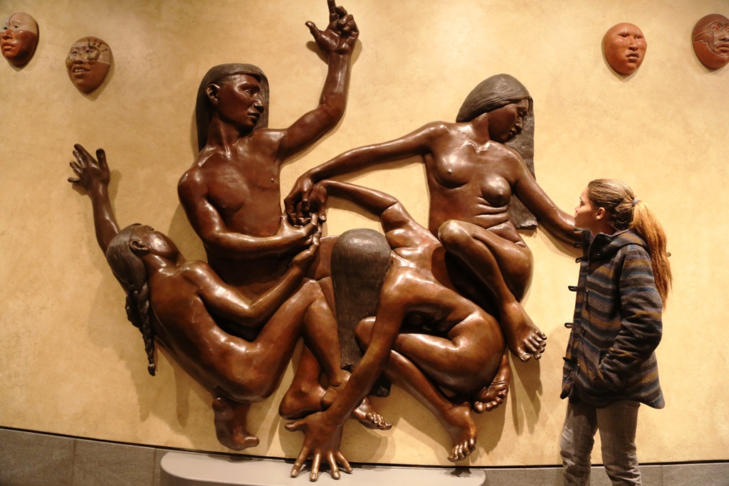 Camila pesquisa arte indígena no Museu dos Povos das Américas.