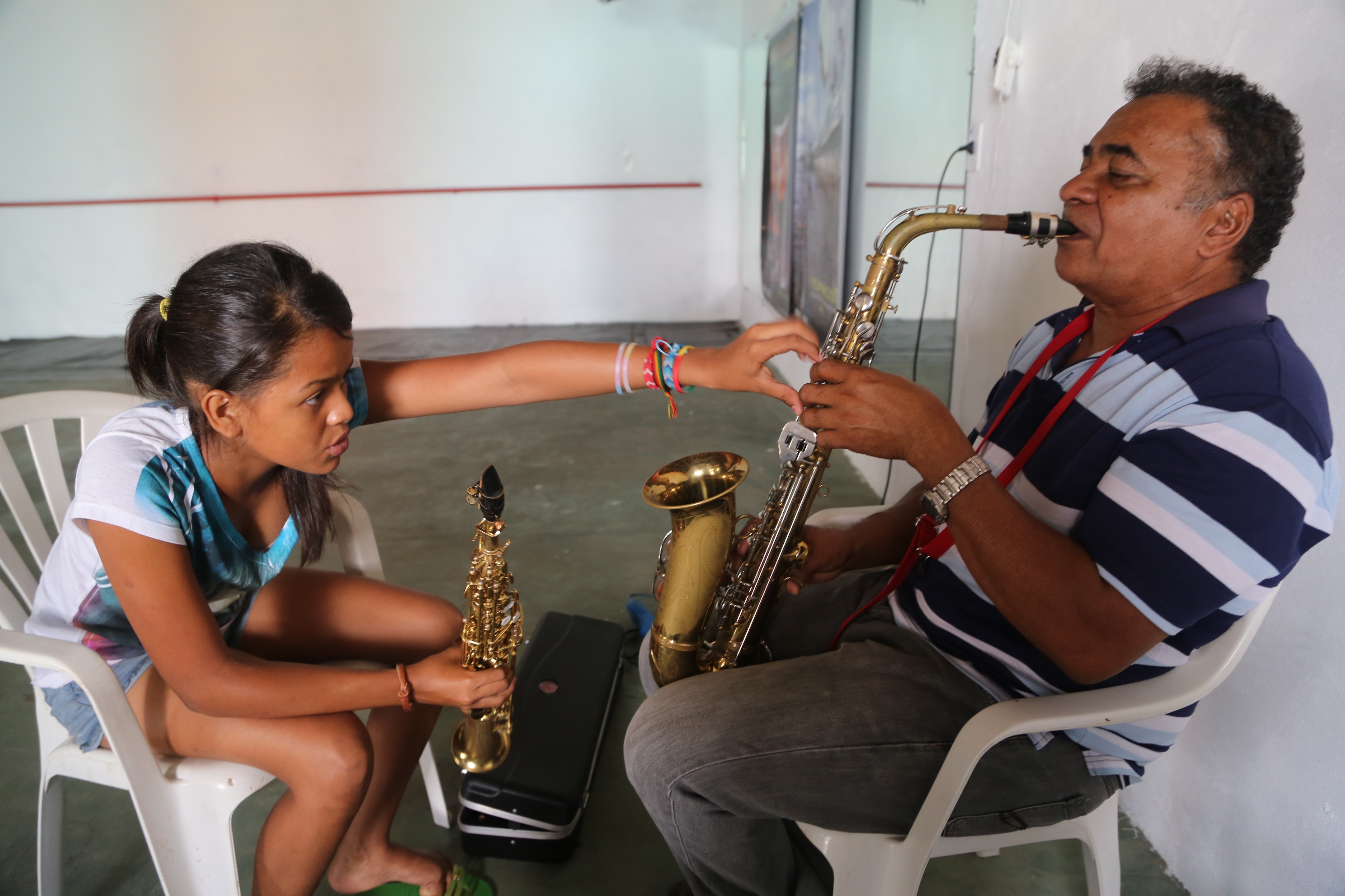 Artista e arte educadora Evany Valente (15 anos) ensina mestre Zequinha numa aula de sax. Ambos vão oferecer cursos no Festival de Verão.