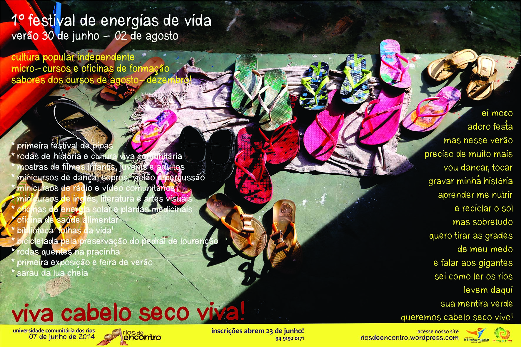 Detalhes sobre cada curso do Festival de Verão: Energia de Vida são disponíveis de Mano Souza (riosdeencontro@gmail.com e fone: 91 8842 0521), a partir do dia 18 de junho. Inscrições abrem no dia 23 de junho.