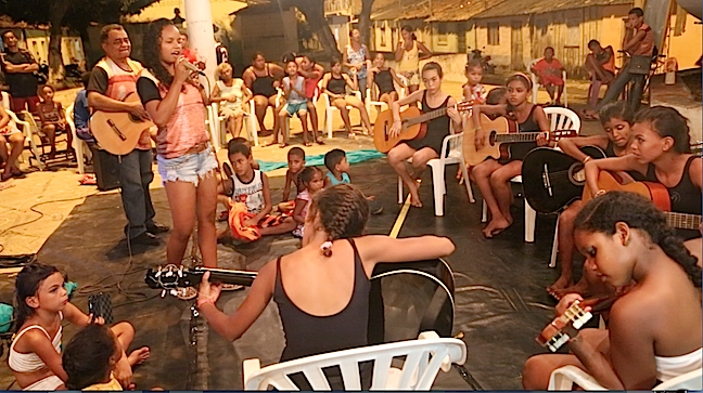 Cantora das Latinhas de Quintal, Carolayne Valente, apoia Zequinha Sousa e sua roda juvenil ‘Violões da Vida’ no palco do Festival Beleza Amazônica.