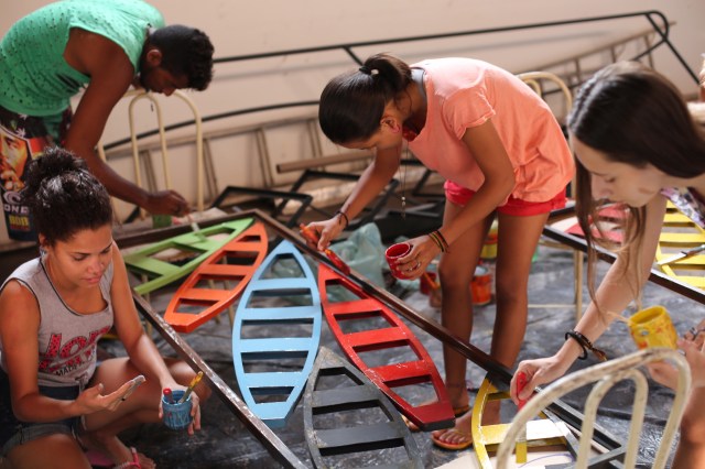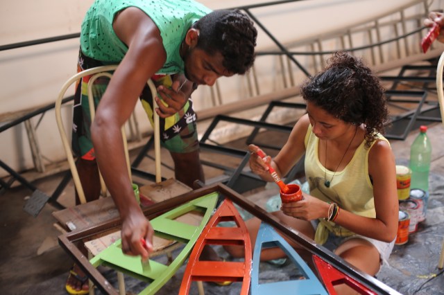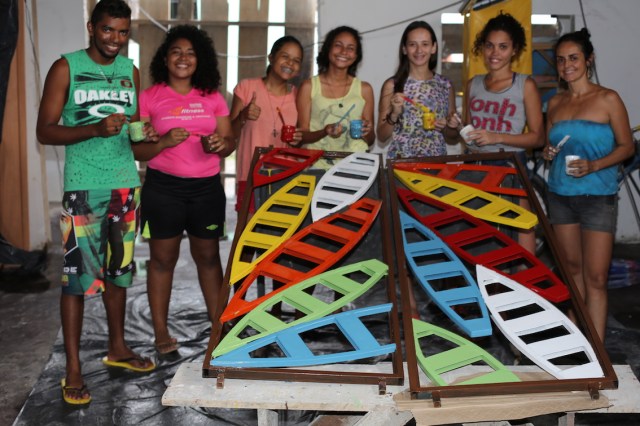 Estagiários (esq à dir), Rerivaldo, Elisa, Évany, Alanes, Lorena, Camylla e (coordenadora) Mano do Afro-Raíz pintam as esculturas-janelas da Casa dos Rios para celebrar Dia Internacional de Ação pelos Rios (14.03.17)