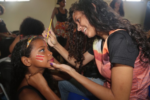 Alanes Yanca (Biblioteca Folhas da Vida) prepara a Hillary para a preparação do AfroRaiz. Todas tem inteligência múltipla artística bem avançada.