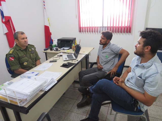 O Comandante Roosevelt da Polícia Militar em Marabá conversa com Alan e Rómulo sobre energia solar no batalhão.