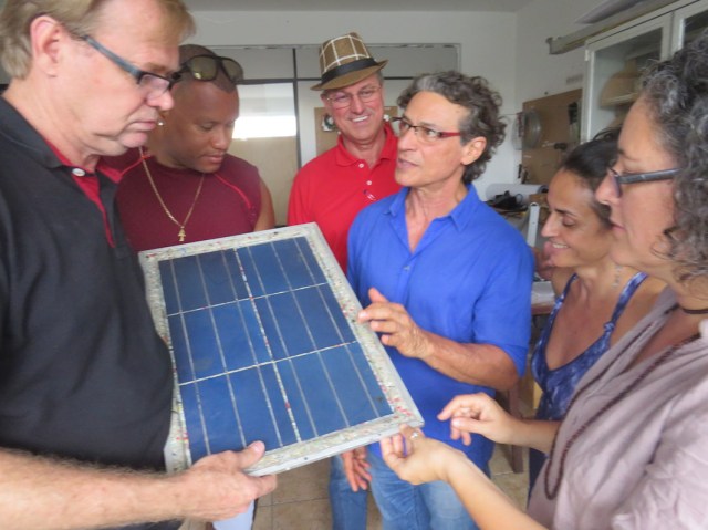 Villi Seilert explica à gestores da ABRA o processo de criar a primeira placa solar da Fábrica Solar Social, feita com materiais reciclados por uma comunidade popular.