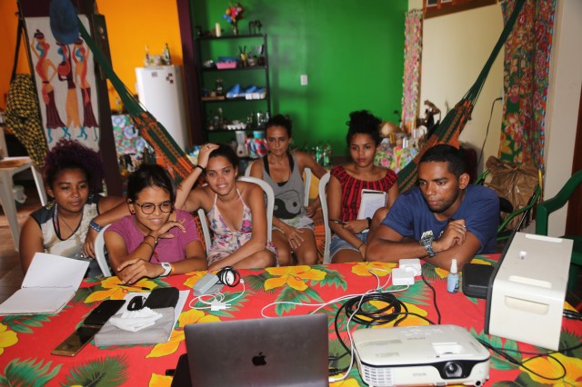 Elisa Neves, Evany Valente, Camylla Alves, Mano Souza, Katrine Alves e Rerivaldo Mendes estudam o documentário Nosso Planeta para entender colapso climático.