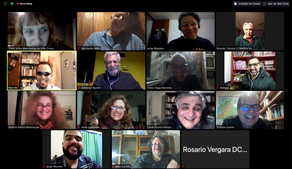 Rios de Encontro convocou uma primeira roda da Rede Brasileira de Arteducadores (ABRA) e parceiros do projeto Silk Roads (Ruas de Seda) em Abril de 2020 para pensar sobre solidariedade em tempos de pandemia. “Começamos acendendo uma vela para lembrar todos que passaram ou perderam alguém durante o Pandemia Covid19. Cantamos e trocamos experiências de lockdown,” explica Dan Baron. “Nós, arte-educadores de Marabá, Juiz de Fora e Moeda (MG), Salvador (BA), São Luis (MA), Florianópolis (SC), Lima (Peru), Auckland (Nova Zelândia), Kampala (Uganda), Lille (França), Barcelona (Espanha), Taipei (Taiwan) e Hong Kong, descobrimos uma sede profunda em comum pelo abraço real, conversa íntima, e desejo de caminhar com calma e confiança. Após duas rodas, formamos um núcleo gestor para reunir mensalmente em busca de uma metodologia artística de Bem Viver, rumo ao Dia Mundial da Amazônia.