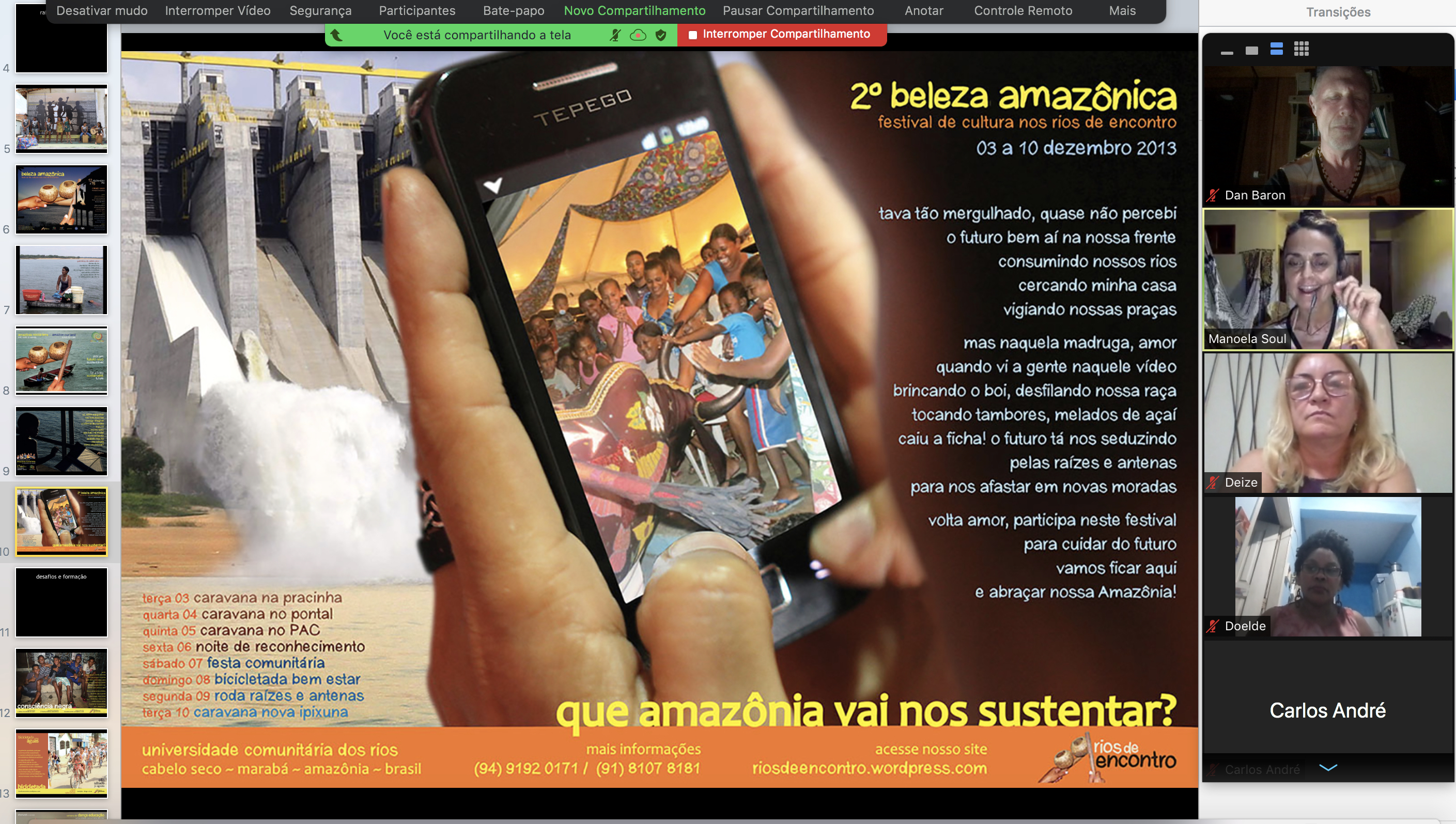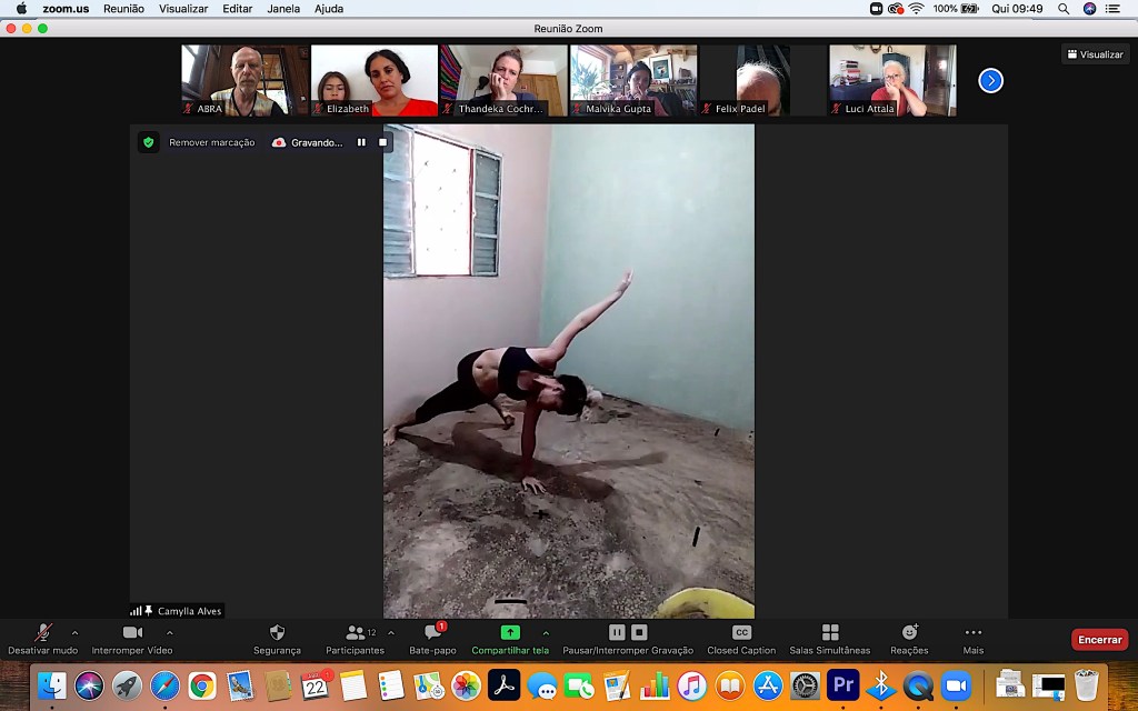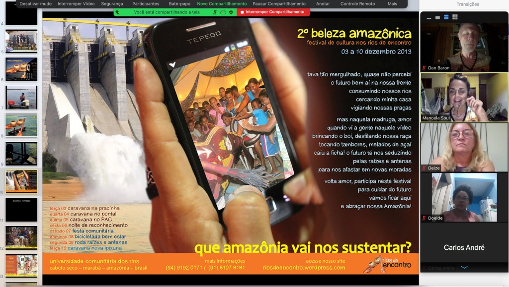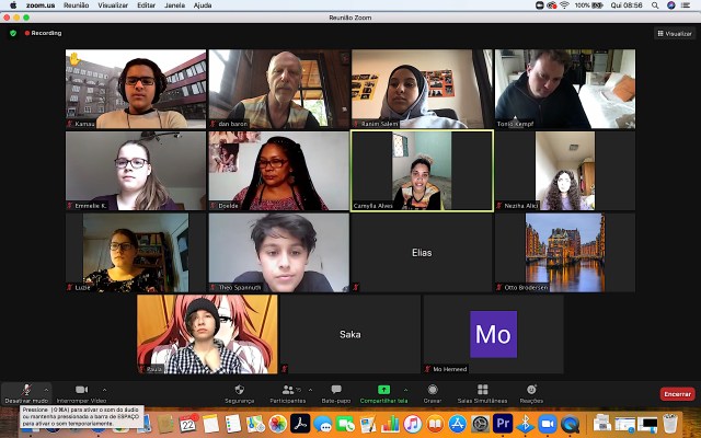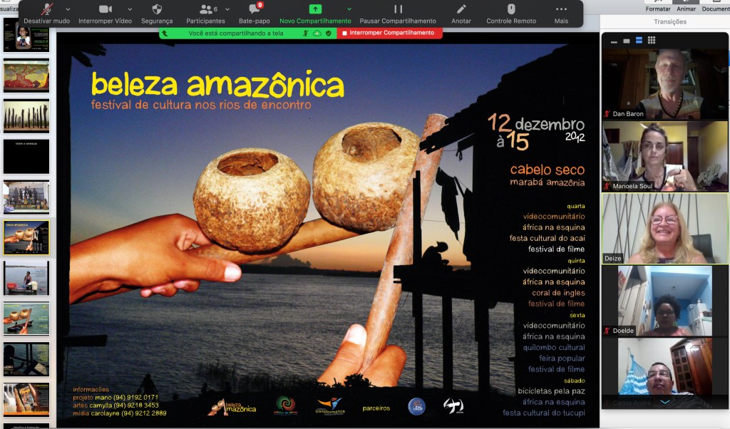 Amanheceu com um encontro virtual entre a dançarina e educadora Camylla Alves e Dan Baron, diretor artístico de Rios de Encontro, 12 alunos e Professor Tonio Kempf da escola Klosterschule Hamburgo, Alemanha, e Professora Doelde Ferreira da Escola EM Irmã Deodoro de Marabá, para cultivar uma colaboração eco-pedagógica através de performance ao cuidar do planeta.