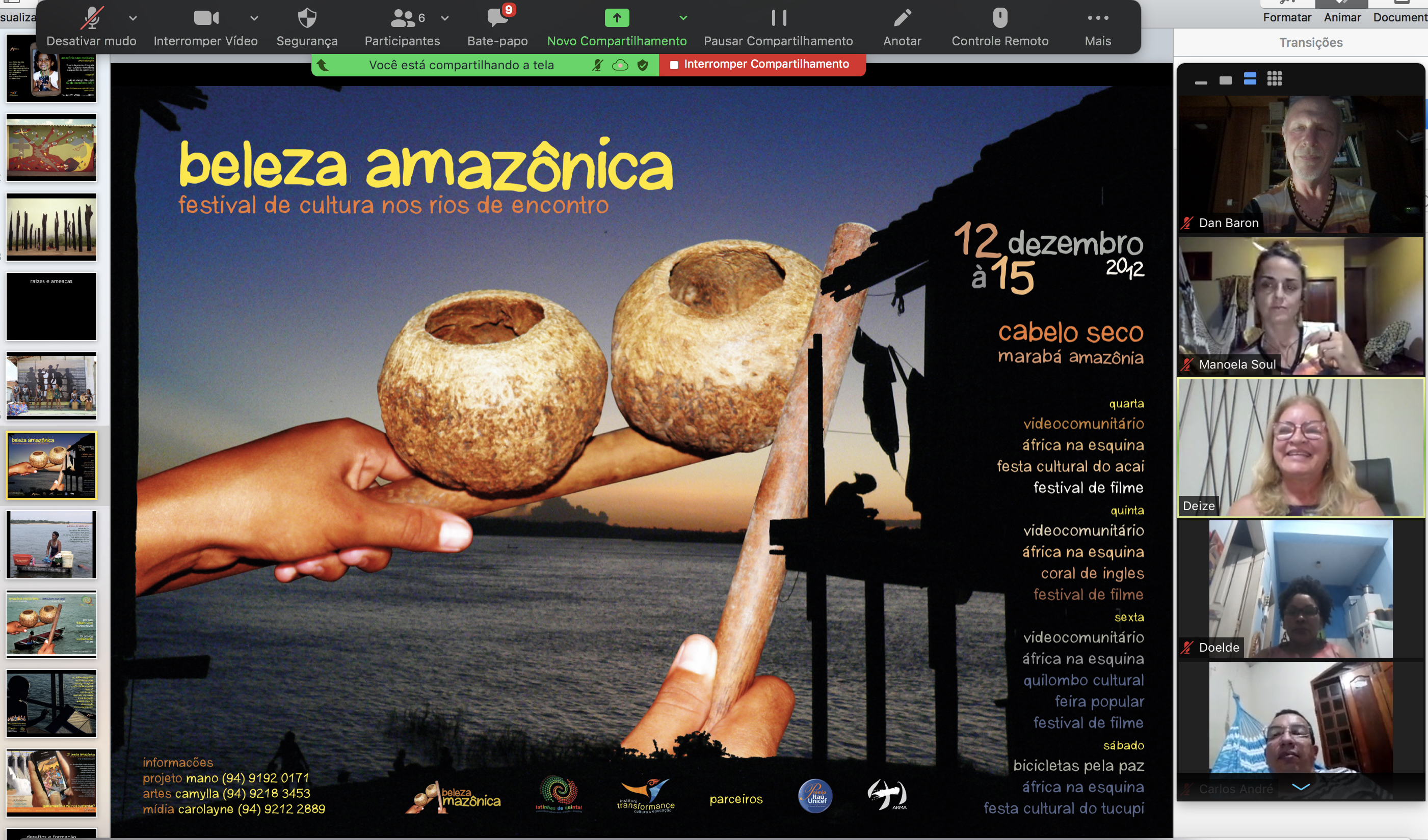 Na live realizada no dia 07 de dezembro, uma roda adulta conhecia a exposição virtual, para focalizar prioridades na segunda década do projeto. A chuva dificultou a participação de parceiros da UNIFESSPA, AESSPA e gestoras de Cabelo Seco, mas Livy Malcher (muralista de Belém), Deize Botelho (gestora cultural), Carlos André Souza (educador), Doelde Ferreira, Manoela e Dan gravaram duas horas de diálogo para criar um recurso ecopedagógico para Marabá e a região.