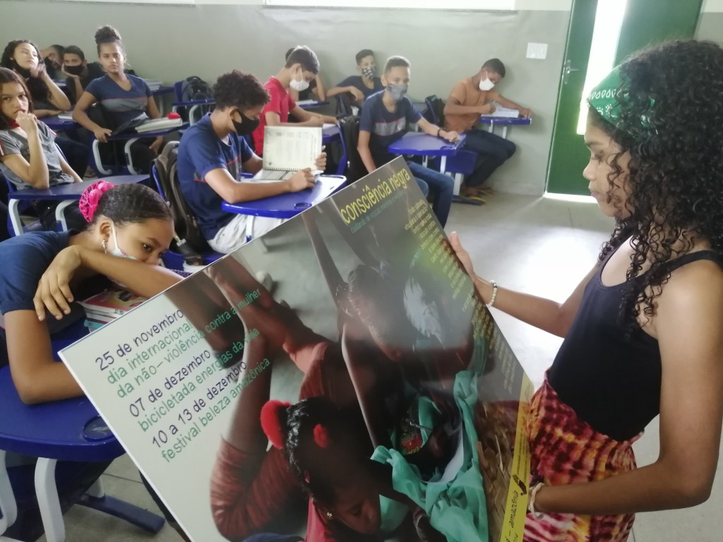 “Markus explicou o quanto se conheceu e se libertou dançando suas raízes. Dan logo convidou Kemilly pegar um quadro da exposição que retrata a Biblioteca Folhas da Vida do projeto, e ler o poema Consciência Negra. Kemilly leu, captou e recitou o poema que narra a experiência de uma criança se abrindo, se lendo e escrevendo sua história, desenhando e dançando. Todos aceitaram o convite para colaborar com uma escola indígena e com uma escola solidária com Amazônia na Alemanha!”